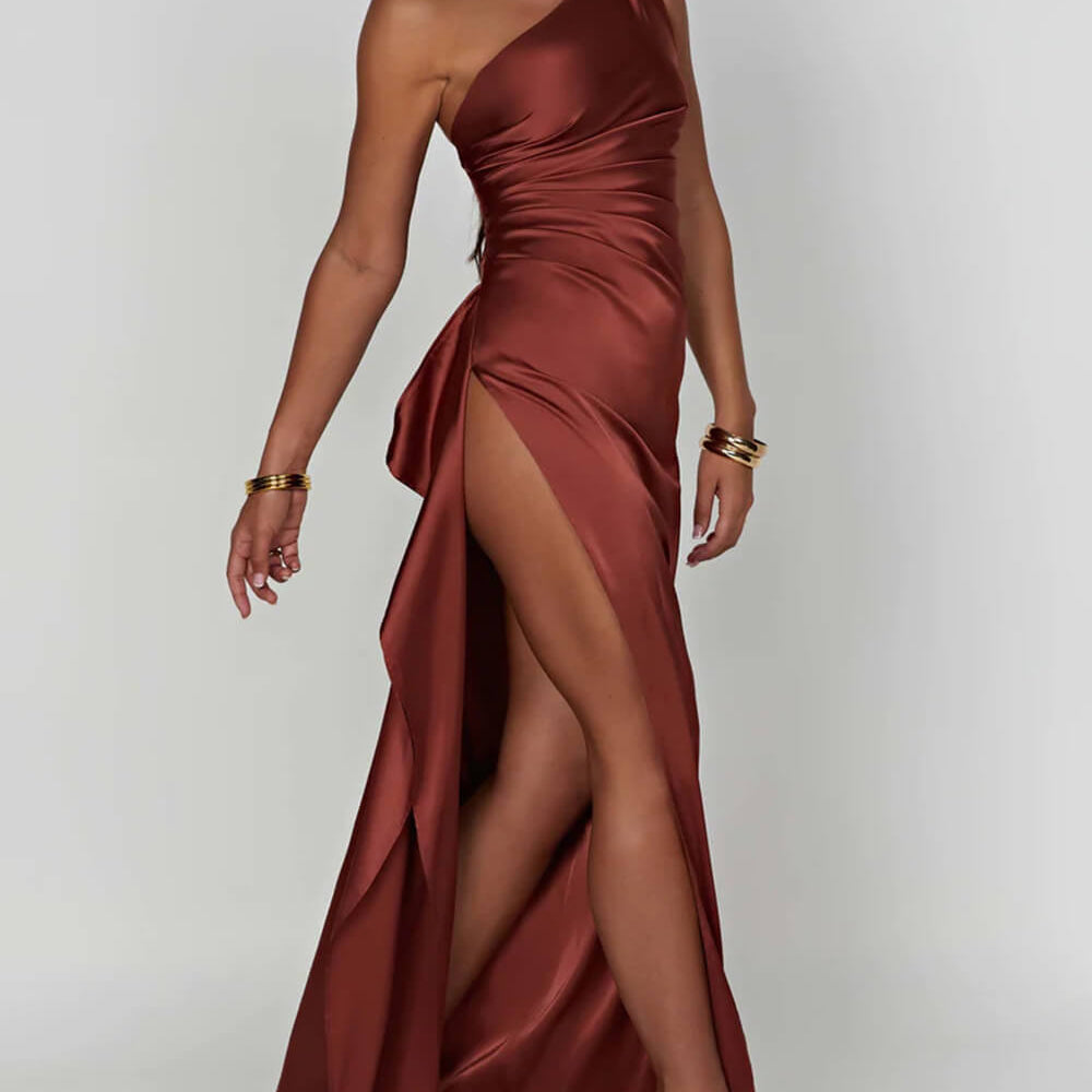 Robe Maxi en Satin à Une Épaule avec Fente Haute