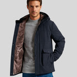 This warm hooded men jacket is designed for cold weather. Built to withstand the harshest winter conditions, this men's hooded jacket offers protection against wind, rain, and snow. The water-resistant outer shell shields you from the elements, while the cosy fleece-lined interior provides warmth.