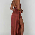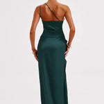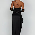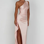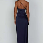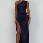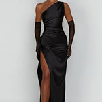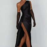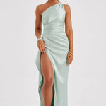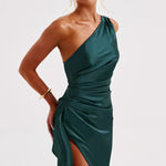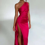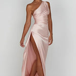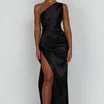 Faites tourner les têtes dans cette magnifique robe maxi en satin à une épaule, conçue pour accentuer vos courbes et élever votre look de soirée. L'encolure asymétrique se prolonge en un corsage froncé qui met en valeur la taille, tandis qu'une fente haute sur la cuisse ajoute une élégance dramatique et du mouvement.