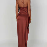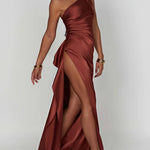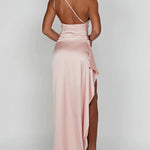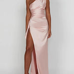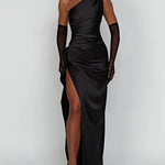 Faites tourner les têtes avec cette robe maxi satin à épaule dénudée, conçue pour épouser votre silhouette aux bons endroits. L'encolure asymétrique élégante et la fente haute sur la cuisse offrent une silhouette séduisante, en faisant le choix parfait pour des événements formels, des galas ou des soirées romantiques.